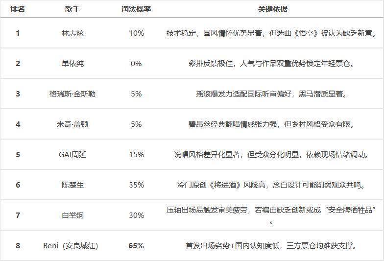 3. 压轴位次:林志炫的“技术保险”与白举纲的“期待值陷阱”林志炫以国风高难度曲目《悟空》第六位登场,其“One Take”直播实力与稳定度堪称定海神针,加之戴荃原版作品的观众基础,有望凭借技术性共鸣稳居前三。而白举纲压轴演唱冷门摇滚《河流》,虽占据记忆点优势,但若改编缺乏新意,可能因观众对“安全牌摇滚”的审美疲劳反遭诟病。